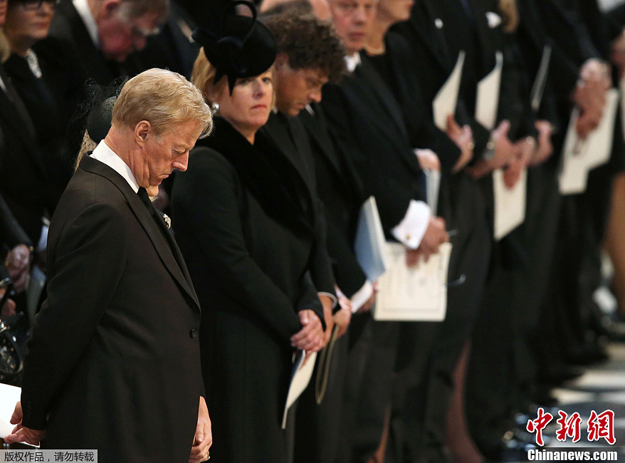 当地时间4月17日,英国前首相撒切尔夫人葬礼在圣保罗大教堂举行。图为撒切尔夫人儿子马克(左)和女儿卡罗尔(左二)参加葬礼。