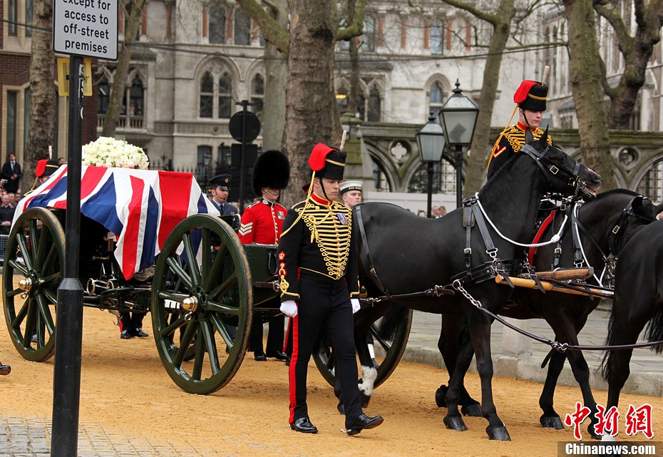 4月17日,英国政府为前首相撒切尔夫人举行隆重的葬礼,英国女王伊丽莎白二世、首相卡梅伦及来自世界各地的政要出席葬礼。图为英国皇家炮兵部队运送撒切尔夫人灵柩前往圣保罗大教堂。周兆军 摄