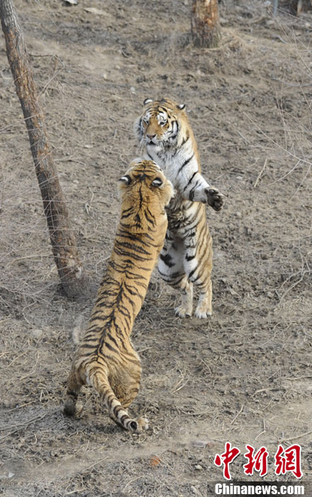 近日来,长春气温回升,告别连日的雨雪天气。4月17日,长春市动植物园中的动物们也到户外享受春日暖阳。图为两只老虎在嬉戏打闹。张瑶 摄