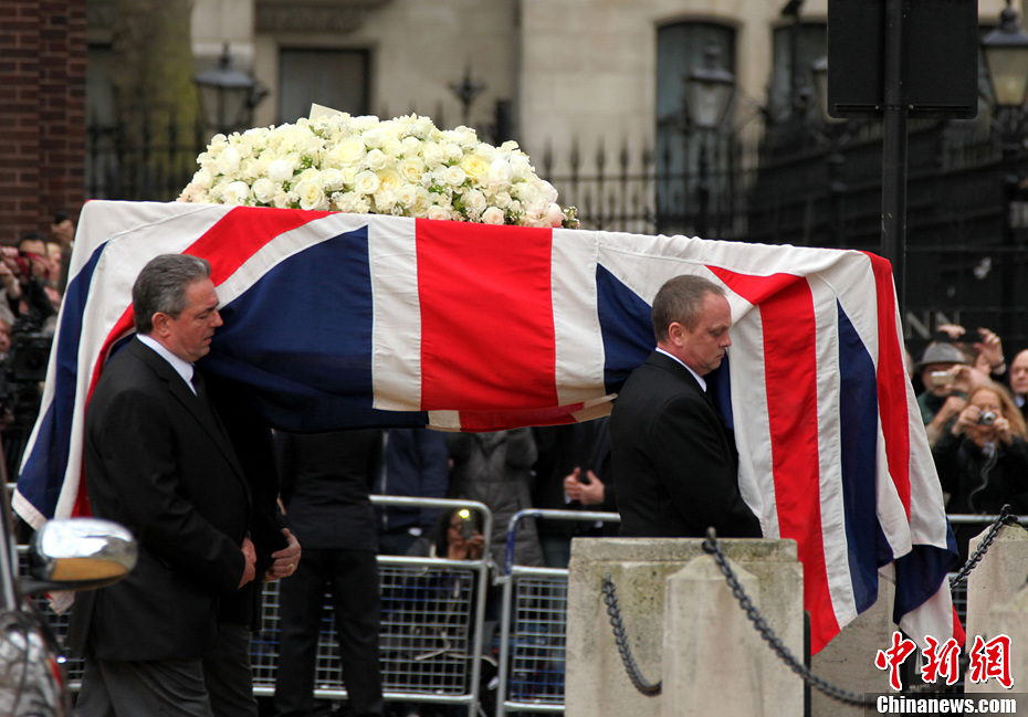4月17日,英国政府为前首相撒切尔夫人举行隆重的葬礼,英国女王伊丽莎白二世、首相卡梅伦及来自世界各地的政要出席葬礼。图为撒切尔夫人灵柩被抬入圣克莱蒙·戴恩斯教堂。周兆军 摄
