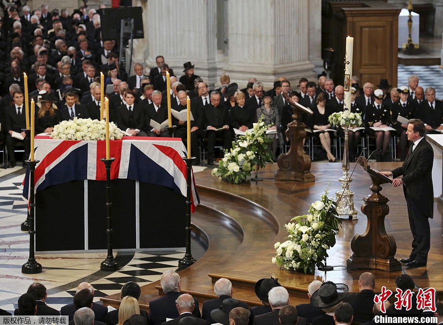 当地时间4月17日,英国前首相撒切尔夫人葬礼在圣保罗大教堂举行。图为英国首相卡梅伦为撒切尔夫致悼词。