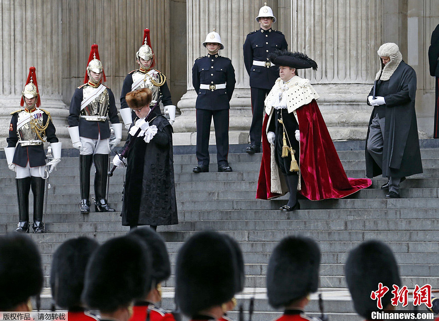 当地时间4月17日,英国前首相撒切尔夫人葬礼在圣保罗大教堂举行。图为伦敦市市长迈克尔·罗杰·吉福德(中)参加撒切尔夫人葬礼。