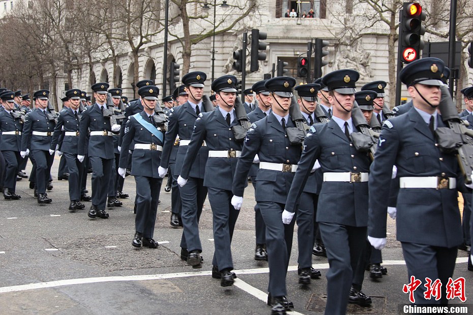 4月17日,英国政府为前首相撒切尔夫人举行隆重的葬礼,英国女王伊丽莎白二世、首相卡梅伦及来自世界各地的政要出席葬礼。图为英国皇家空军护送撒切尔夫人灵柩。周兆军 摄