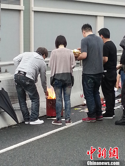 2013年4月17日,香港,香港乐坛女新人陈僖仪发生严重车祸身亡。陈僖仪家人进行路祭,天降大雨倍添伤感。图片来源:东方IC 版权作品 请勿转载