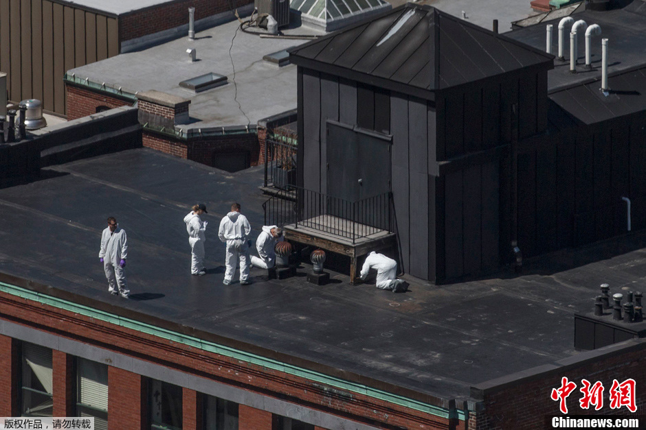 当地时间2013年4月17日 ,美国波士顿,调查人员在马拉松爆炸案案发地点附近的屋顶收集证据。调查人员称,他们已经通过爆炸案发生前的一段监控录像中确定了一位犯罪嫌疑人。