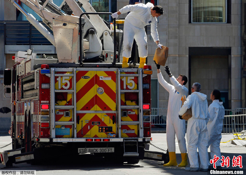当地时间2013年4月17日 ,美国波士顿,调查人员在马拉松爆炸案案发地点附近的屋顶收集证据。调查人员称,他们已经通过爆炸案发生前的一段监控录像中确定了一位犯罪嫌疑人。