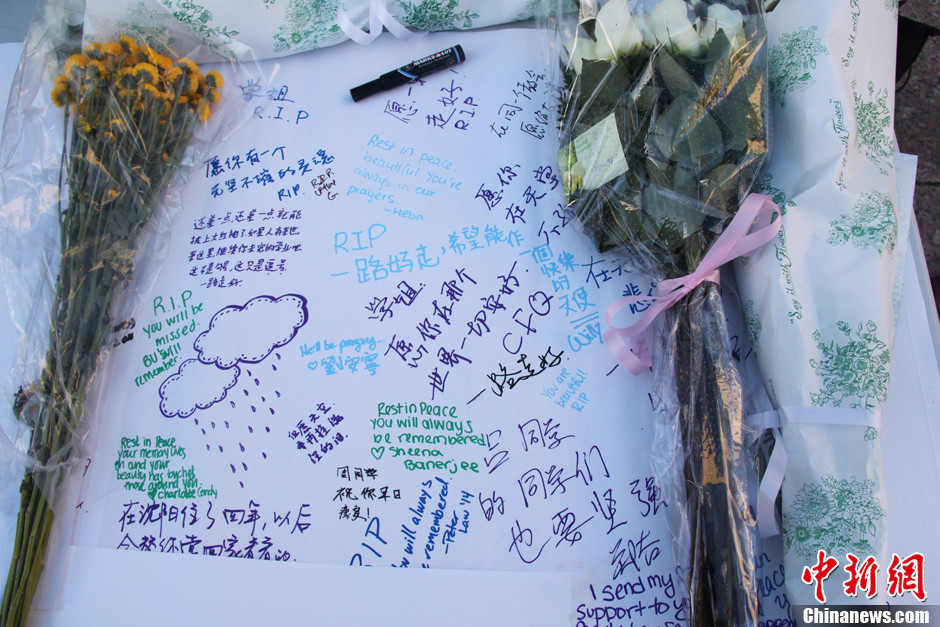 当地时间4月17日,波士顿大学的中国留学生举行追思活动,悼念15日在波士顿马拉松爆炸案中不幸遇难的中国女留学生。这名遇难的女留学生是该校研究生,一张留言板上写满了师友们对她的无限哀思。中新社发 李洋 摄