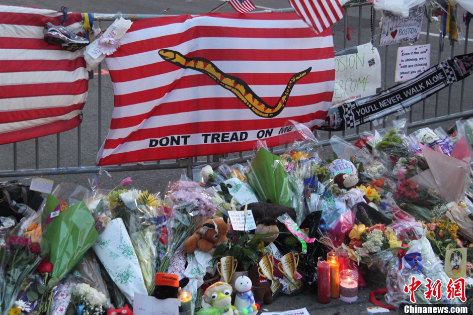 当地时间2013年4月17日,民众在波士顿爆炸案现场为死难者举行肃穆的哀悼活动。波士顿15日举办马拉松比赛期间发生爆炸事件,造成百余人伤亡,遇难者中有一名中国留学生。中新社发 李洋 摄