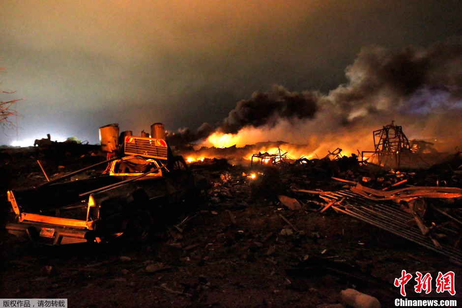 当地时间2013年4月18日凌晨,美国德克萨斯州,化肥厂发生爆炸后的残骸。17日德克萨斯州一化肥厂发生爆炸,造成多人死伤。爆炸还造成包括一所学校和疗养院在内的数十栋居民楼的毁坏。