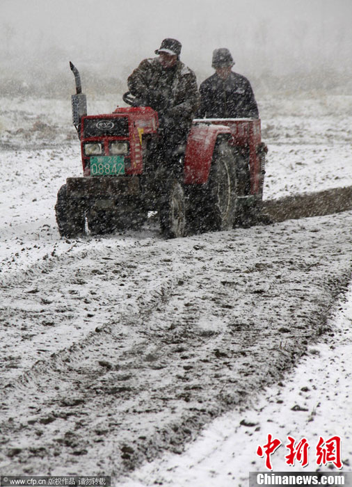 据中央气象台消息,4月19~20日,受较强冷空气影响,西北地区东南部、华北中南部至江南北部有4~8℃降温,局地可达10℃,上述部分地区并伴有4~6级偏北风。图为4月18日,新疆哈密地区受冷空气影响下起雪。农民冒雪耕地。曹新加 摄 图片来源:CFP视觉中国