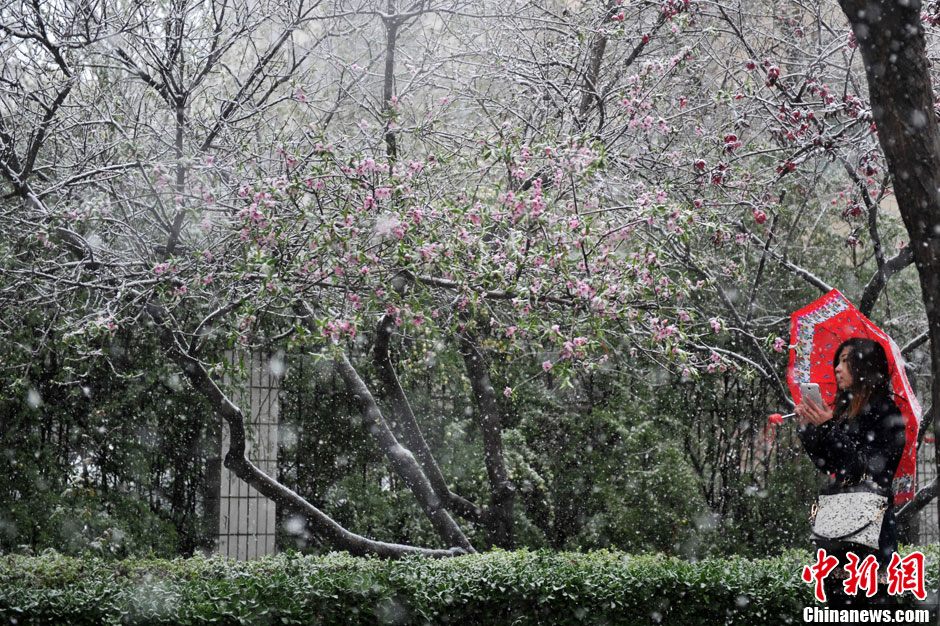 4月19日清晨,河北石家庄普降中雨,8点左右变为鹅毛大雪,纷纷扬扬飘落。图为市民用手机拍雪景。中新社发 翟羽佳 摄
