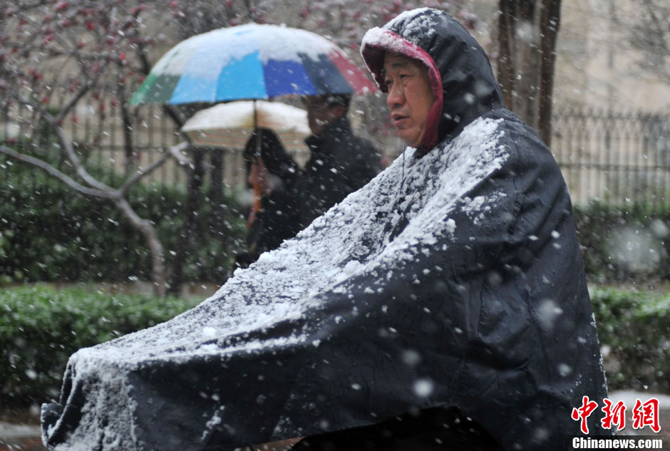 4月19日清晨,河北石家庄普降中雨,8点左右变为鹅毛大雪,纷纷扬扬飘落。图为雪中上班的市民。中新社发 翟羽佳 摄