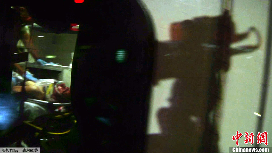 美国警方19日表示,他们已经抓获在逃的波士顿爆炸案嫌疑人焦哈尔•萨纳耶夫。此前,警方在波士顿展开全城搜捕,并将嫌犯围困在沃特敦一座建筑内。当地媒体此前报道,焦哈尔之前藏身于沃特敦一座房屋后院的船内,被警方包围。他早些时候在逃亡中与警方发生激烈交火并受伤。图为视频截图显示, 波士顿爆炸案嫌疑人焦哈尔•萨纳耶夫(Dzhokhar Tsarnaev)被捕后躺在救护床上。