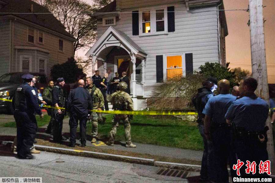 美国警方19日表示,他们已经抓获在逃的波士顿爆炸案嫌疑人焦哈尔•萨纳耶夫。此前,警方在波士顿展开全城搜捕,并将嫌犯围困在沃特敦一座建筑内。图为执法人员聚集在波士顿爆炸案嫌疑人焦哈尔•萨纳耶夫(Dzhokhar Tsarnaev)被捕地点附近。