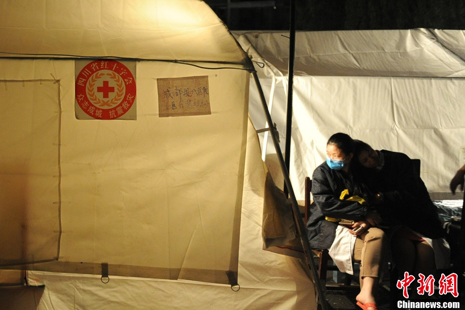 4月20日晚,四川芦山7.0级地震后的首个夜晚,芦山县人民医院临时救治点显得十分宁静,当日受伤的民众在此接受治疗,一些民众也在此搭建起帐篷熟睡。中新社发 张浪 摄