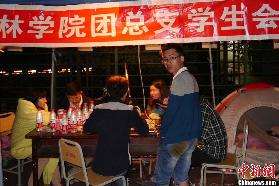 4月21日凌晨,中新社记者在雅安市内的四川农业大学第一教学区看到,受地震影响,该校不少学生选择在操场、教学楼、学校路边、课桌、食堂等场所休息、上网、下棋。图为学生社团干部坚守在操场。高维峰 摄