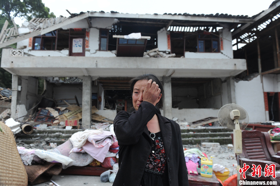 4月20日,四川芦山县发生7.0级地震,芦山大地满目疮痍。图为芦山县龙门乡古城村村民在震后的家园前留影。中新社发 张浪 摄