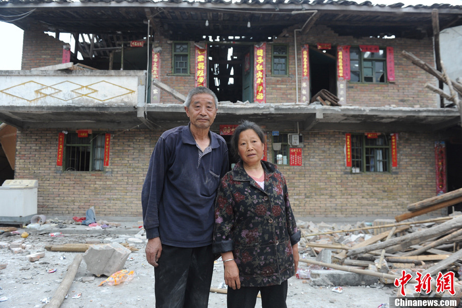 4月20日,四川芦山县发生7.0级地震,芦山大地满目疮痍。图为芦山县龙门乡古城村村民在震后的家园前留影。中新社发 张浪 摄
