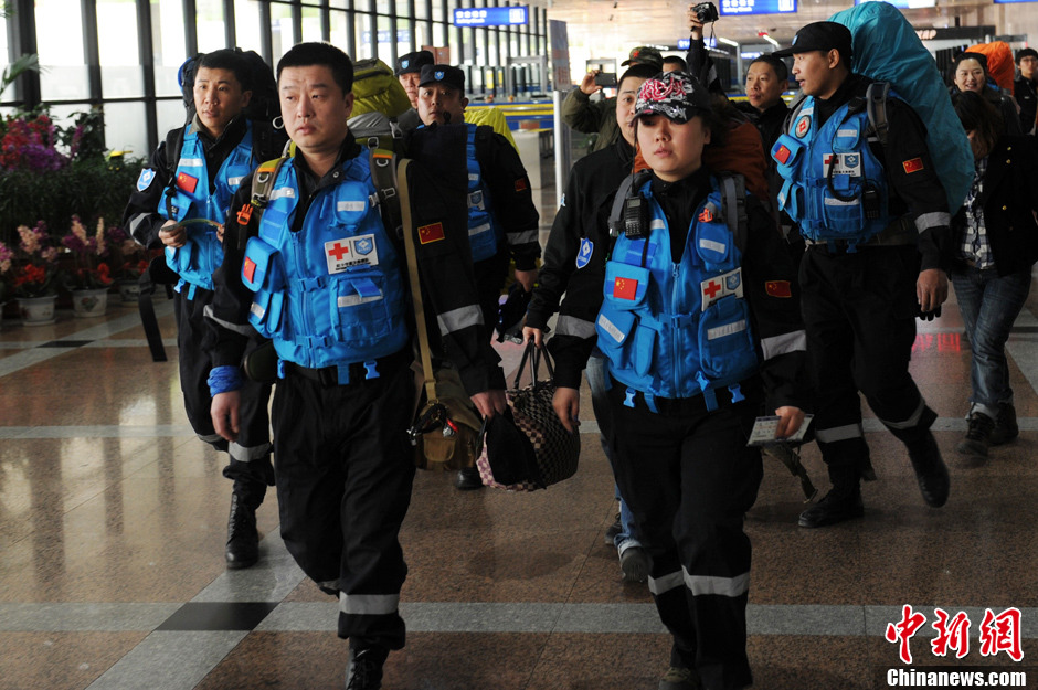 4月21日5时,8名黑龙江蓝天救援队队员携带专业装备前往四川雅安地震灾区参与救援。救援队员前往登机口登机奔赴四川。中新社发 胡迪 摄