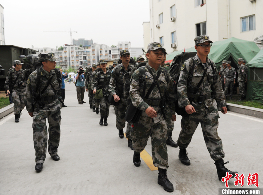 4月21日,四川芦山县人民医院内成都42医院的医护人员即将通过直升机空运至地震震灾区宝兴,图为第一批空运进入宝兴的医疗队,医护人员携带了抢救必须的药品。中新社发 刘忠俊 摄