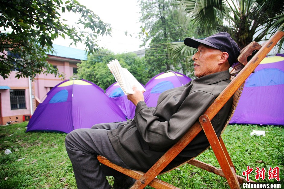 雅安市民乐观面对震灾——帐篷旁的晨读