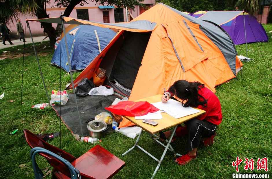雅安市民乐观面对震灾——不忘功课