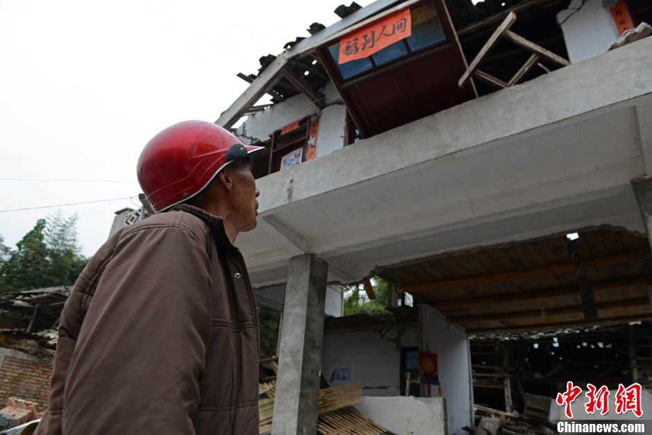 4月21日,芦山县龙门乡古城村的一位村民检查自己在地震中受损的房屋。中新社发 张元 摄