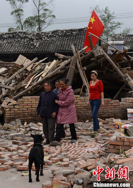 4月21日,一位雅安当地民众在家人的搀扶下离开自家废墟,他们在地震中失去亲人。中新社发 张元 摄