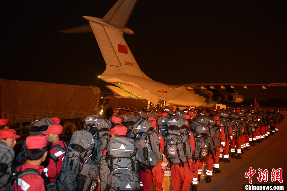 4月21日凌晨5时20分,由空军航空兵某师副师长刘文力带队的两架伊尔—76型运输机,满载国家地震灾害紧急救援队180多名队员、12条搜救犬和专业救灾装备,安全降落在四川某军用机场。据了解,空军两架运输机于20日22时08分从湖北某军用机场起飞赴北京南苑机场,经过近3个小时准备,于21日凌晨2时30分从南苑机场紧急起飞。图为国家地震灾害紧急救援队员集结。中新社发 余红春 摄
