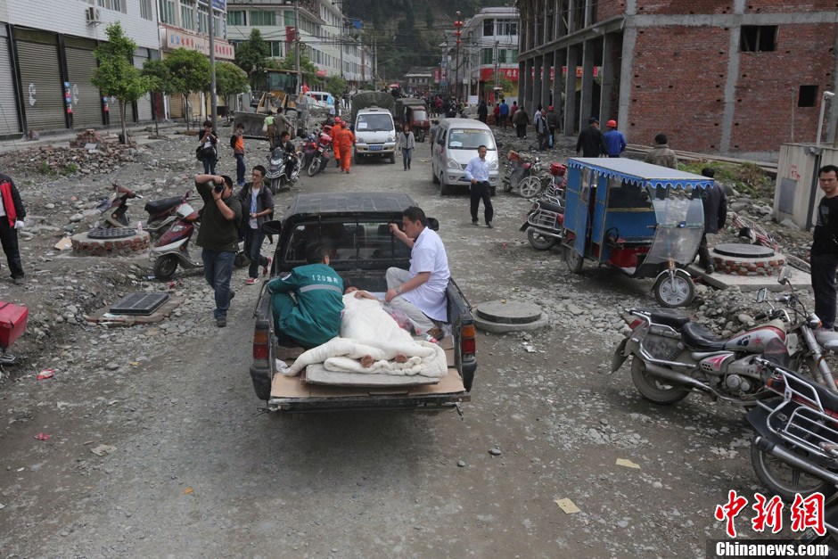 4月21日上午11时许,中新社记者徒步20公里抵达宝兴。图为宝兴县灵关镇门前,一名伤员被志愿者的皮卡车运送往医院。中新社发 许云峰 摄