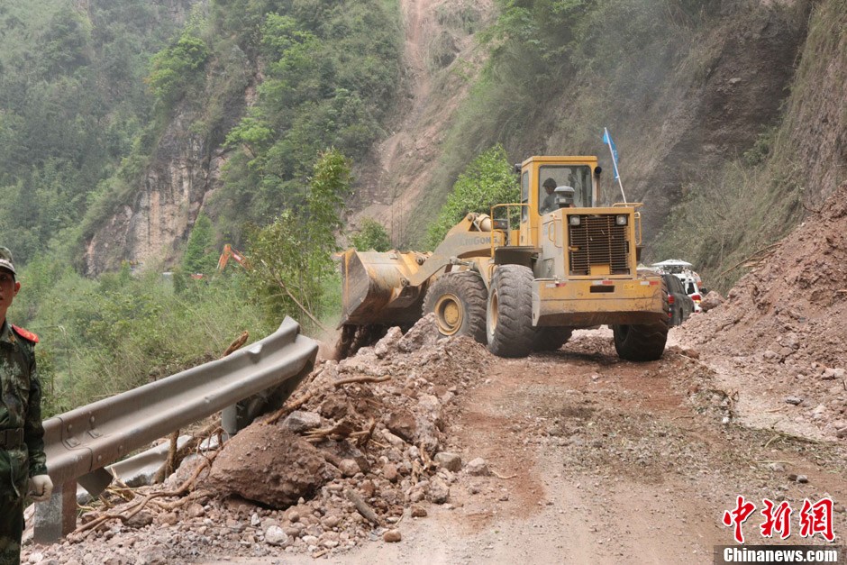4月21日12时许,通往重灾区宝兴的公路尚未恢复,几百名施工人员在距宝兴县城约18公里的位置全力抢修。图为抢修现场。中新社发 史元丰 摄