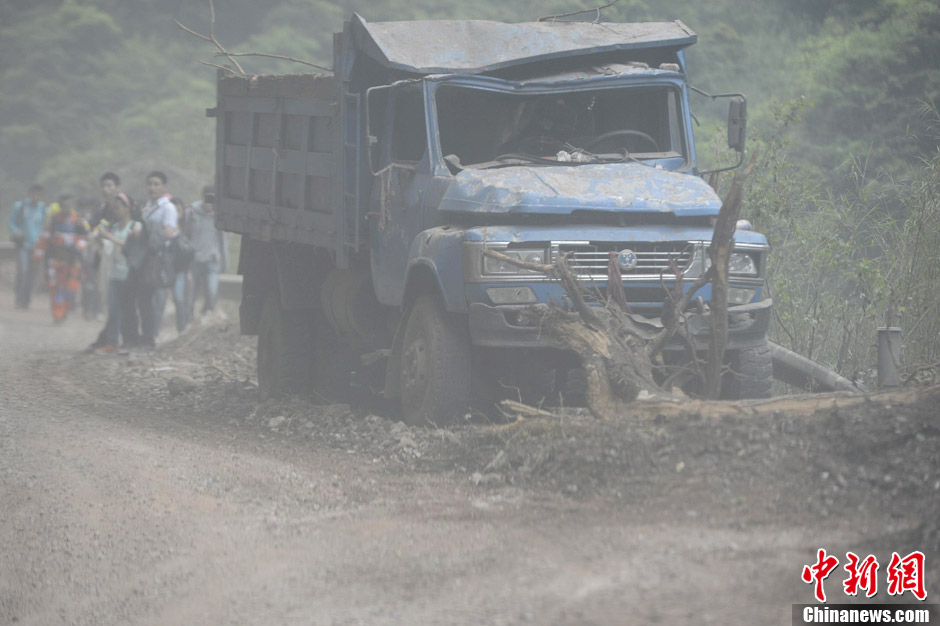 4月21日,通往重灾区宝兴的公路尚未恢复。芦山县通往宝兴县s210省道紧张抢修,与宝兴交通联络水陆空全方位推进。中新社发 廖攀 摄