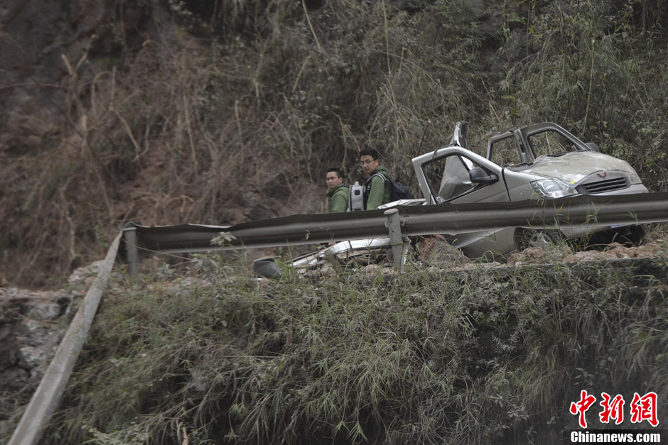 4月21日,救援人员和记者徒步从芦山前往宝兴县。芦山县通往宝兴县s210省道紧张抢修,与宝兴交通联络水陆空全方位推进。中新社发 廖攀 摄