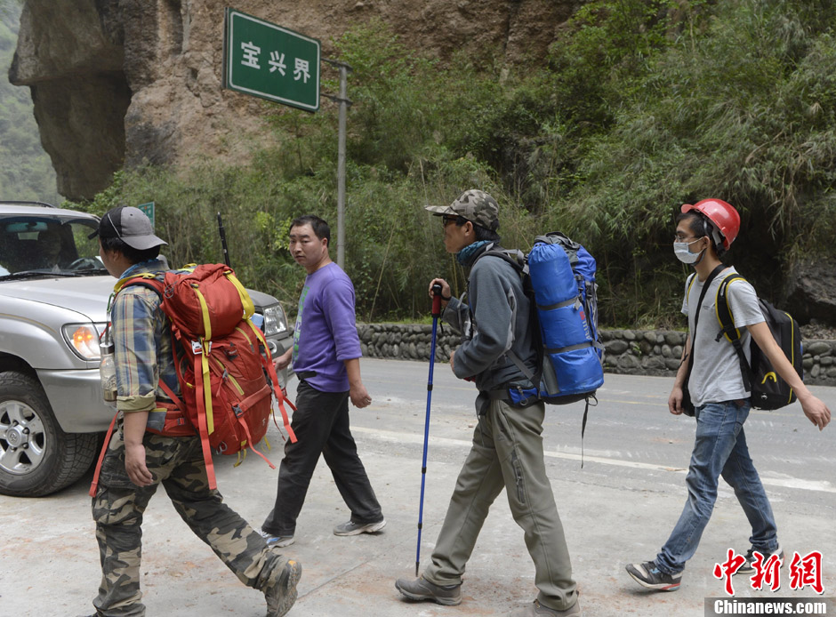 4月21日,救援人员和记者徒步从芦山前往宝兴县。芦山县通往宝兴县s210省道紧张抢修,与宝兴交通联络水陆空全方位推进。中新社发 廖攀 摄