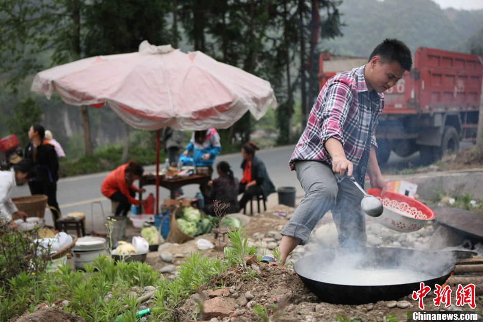 21日12时许,通往重灾区宝兴的公路尚未恢复,几百名施工人员在距宝兴县城约20公里的位置全力抢修。图为芦山通往宝兴公路上的灾民在路边煮饭。中新社记者 史元丰 摄