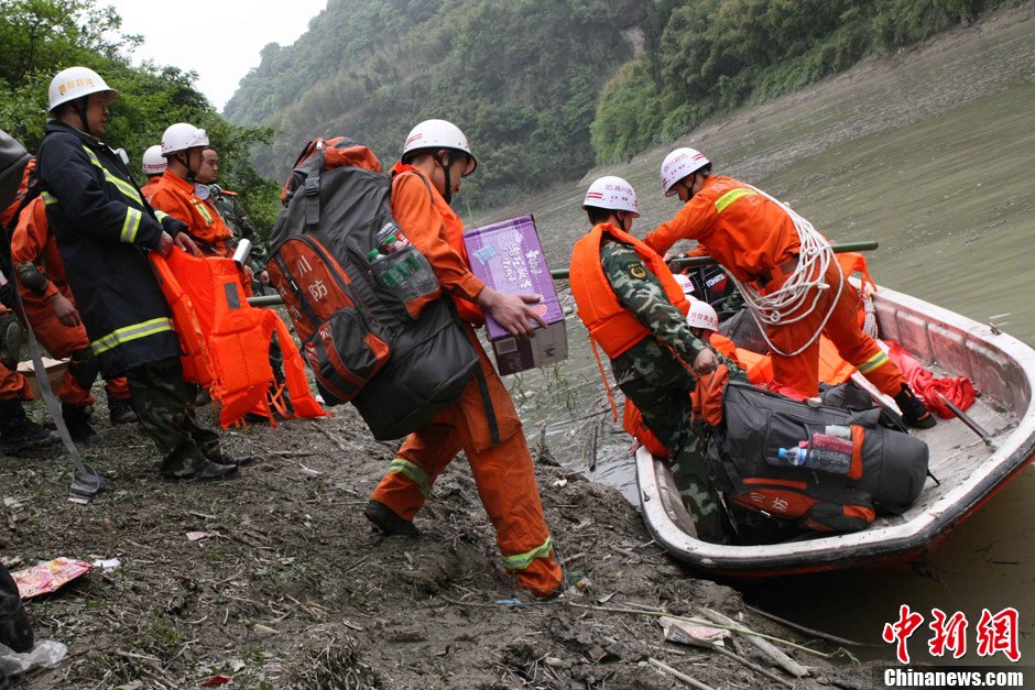 21日早7时许,芦山开通了通往宝兴的水路通道,共有7艘冲锋舟投入救援,已运送百余名救援人员进入灾区。中新社记者 史元丰 摄