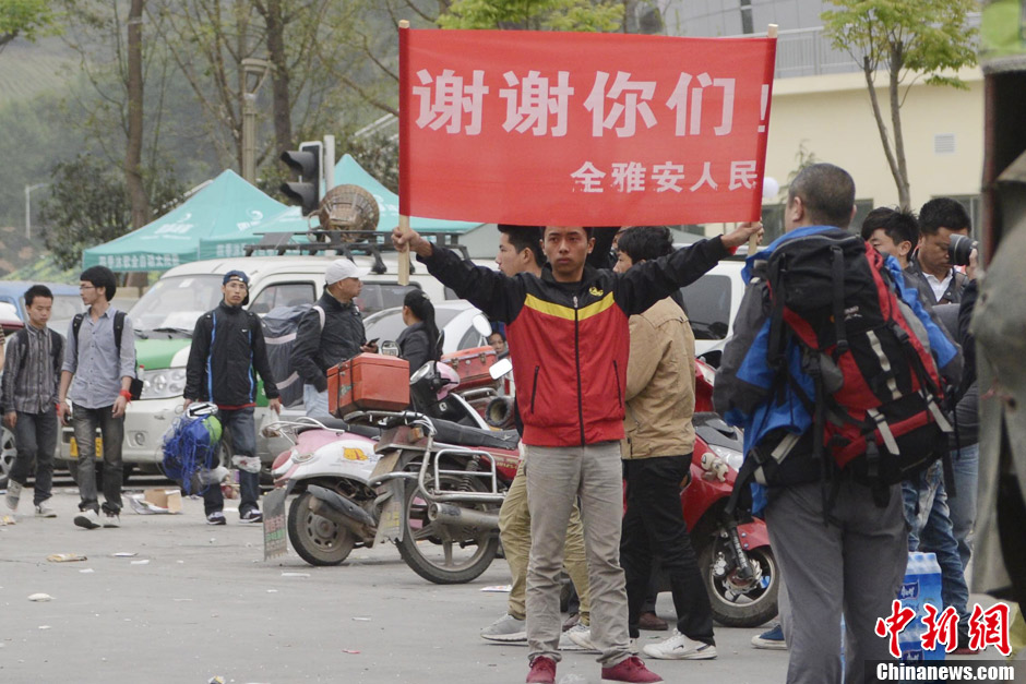 4月21日,一名男子打出“谢谢你们”标语。目前,芦山县通往宝兴县s210省道紧张抢修,与宝兴交通联络水陆空全方位推进。中新社发 廖攀 摄