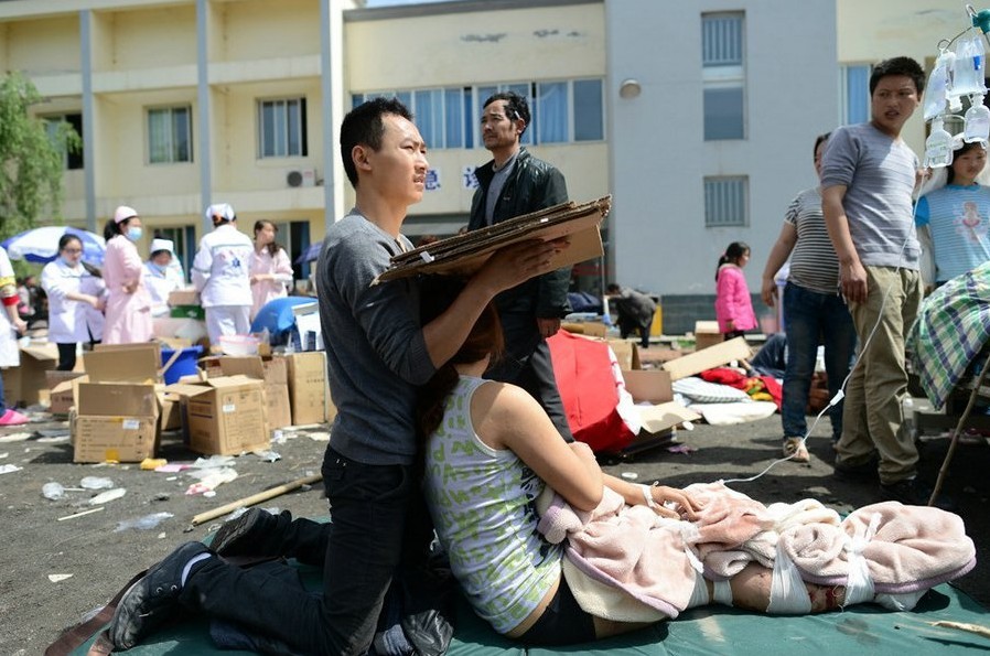4月20日,在芦山县人民医院,伤者在接受救治。一男子跪地给受伤妻子遮阳。图片来源:新华网