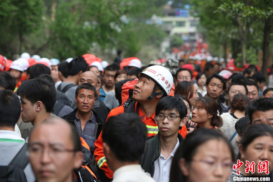 4月21日下午4时许,记者突破一路滑坡落石险境,抵达地震孤城宝兴县。图为下午,宝兴县境内老关口,因地震滑坡封路,前往宝兴县救灾的救援人员和回家寻亲的百姓正在等待道路打通。中新社记者 许云峰 摄
