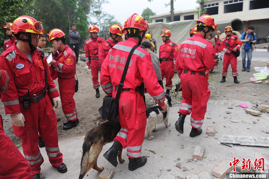 4月21日,百余名中国国家地震灾害紧急救援队队员携搜救犬抵达四川芦山地震灾区,展开搜救。中新社发 张浪 摄