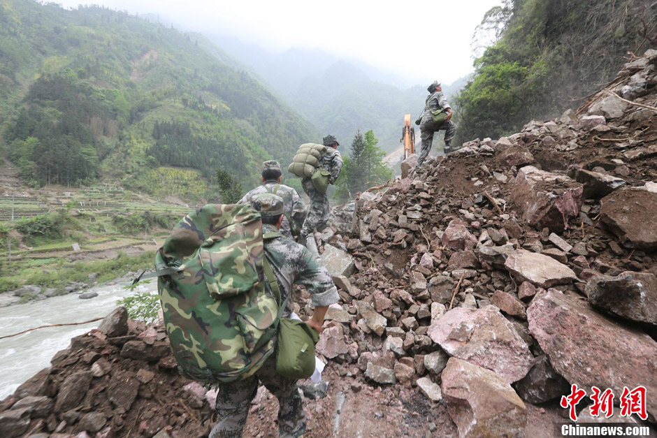 4月21日下午,几名民兵背负重装备爬过地震塌方路口。中新社记者 许云峰 摄