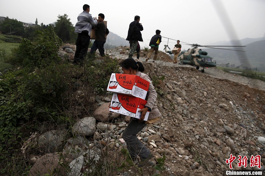 4月21日,四川雅安地震重灾区芦山龙门乡,一位民众正在搬运由直升机送来的一箱方便面。中新社发 张浪 摄