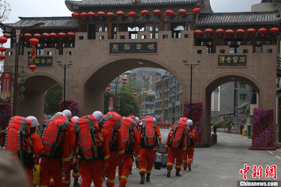 4月21日下午,数百名救援人员突进宝兴县城,列队进入准备施救。中新社记者 许云峰 摄