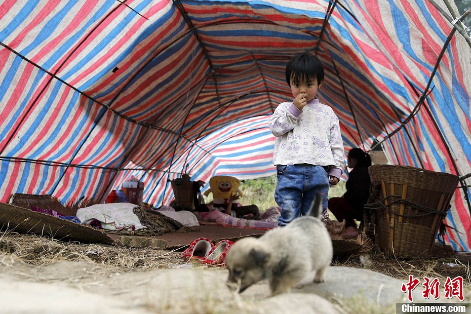 4月21日,四川雅安地震重灾区芦山龙门乡,一个孩子正在农田里的自制简易“抗震棚”中专注地看着自家的小狗。中新社记者 张浩 摄