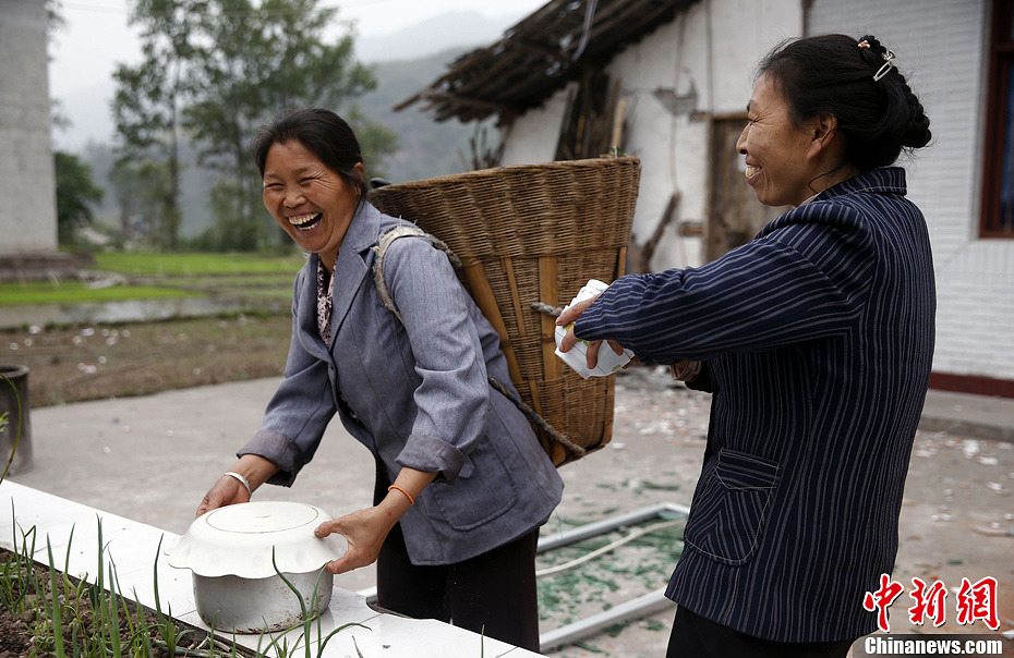 4月21日,四川雅安地震重灾区芦山龙门乡,两位民众正在开心地准备午饭。中新社记者 张浩 摄