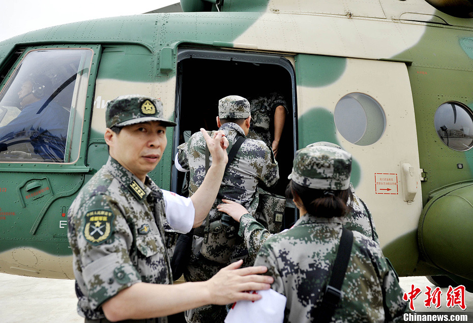 4月21日,四川雅安宝兴县是这次芦山地震中受灾极重的县,至今道路未通,成都空军紧急调直升机驰援宝兴,为灾区运送救灾急需物资,抢运伤员。图为运送救援队伍现场。中新社发 安源 摄