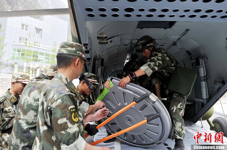 4月21日,四川雅安宝兴县是这次芦山地震中受灾极重的县,至今道路未通,成都空军紧急调直升机驰援宝兴,为灾区运送救灾急需物资,抢运伤员。图为运送物资现场。中新社发 安源 摄