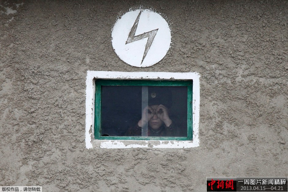 周二,朝鲜新义州附近,一名士兵在鸭绿江岸的守卫塔内透过窗户向外看。