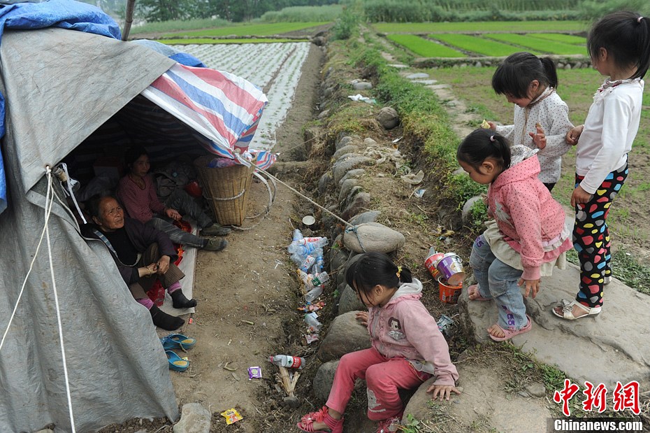 4月21日,芦山地震震中——龙门乡灾区民众自建简易棚,过渡生活。当地孩子把这里当成了游乐场所。中新社发 张浪 摄