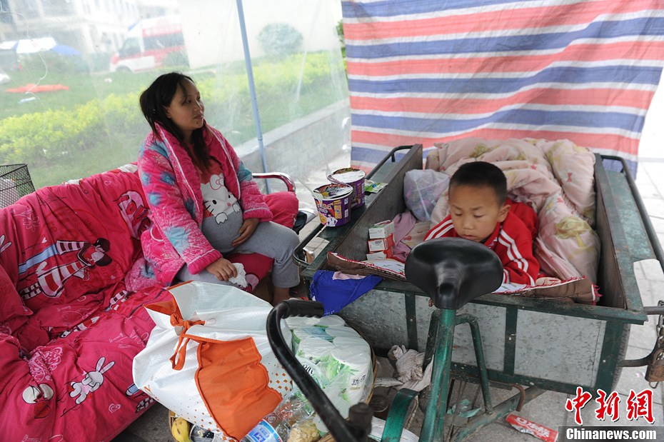 4月21日,四川雅安芦山县人民医院大门口,一位临产期仅7天的妇女搭建起帐篷,与自己丈夫、孩子待在一起,随时等待产子。中新社发 张浪 摄